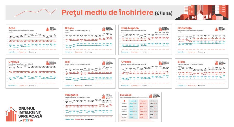 Comparativ cu anul anterior, prețurile medii solicitate pentru închirierea garsonierelor au crescut cu 14% și cele ale apartamentelor cu două camere cu 9%, în timp ce prețurile medii pentru apartamentele cu trei camere au crescut cu 3%. Astfel, în luna decembrie 2024, prețul mediu de închiriere al garsonierelor a fost de 400 de euro, în timp ce apartamentele cu două camere s-au închiriat, în medie, cu 600 de euro, iar apartamentele cu trei camere s-au închiriat cu un preț mediu de 750 de euro.