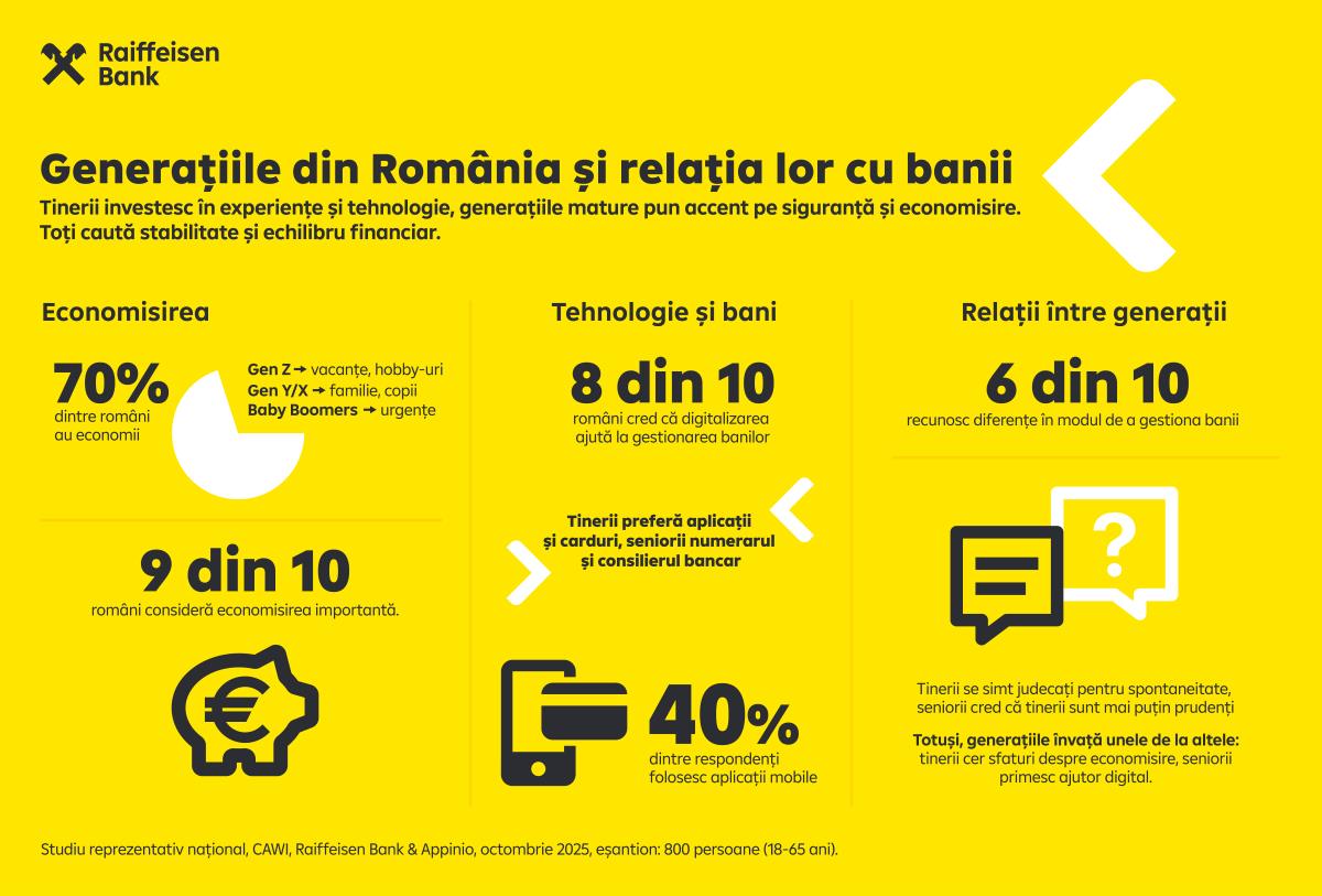 Cercetarea „Diferențe și asemănări între generații” face parte din seria Despre Bani 1:1, derulată de Raiffeisen Bank România. Studiul a fost realizat în colaborare cu Appinio, prin metoda CAWI, pe un eșantion de 800 de persoane cu vârste între 18 și 65 de ani, reprezentativ la nivel național, în luna octombrie 2025.