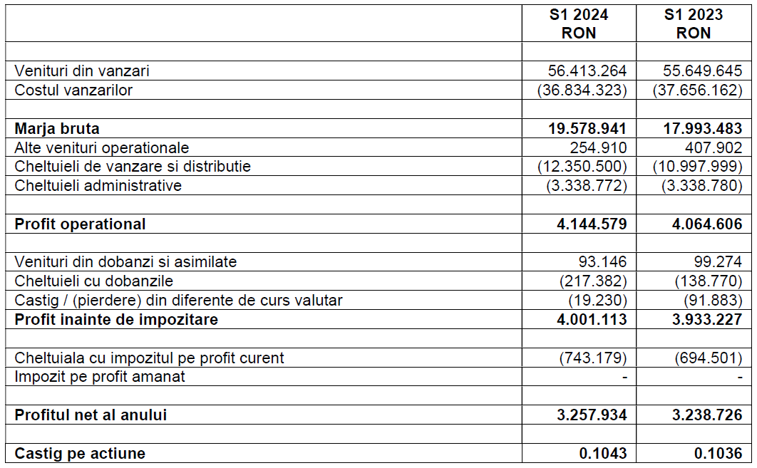 Profitul net al companiei înregistrat în primele șase luni este de 3,25 milioane de lei, de asemenea, în creștere ușoară față de anul trecut.