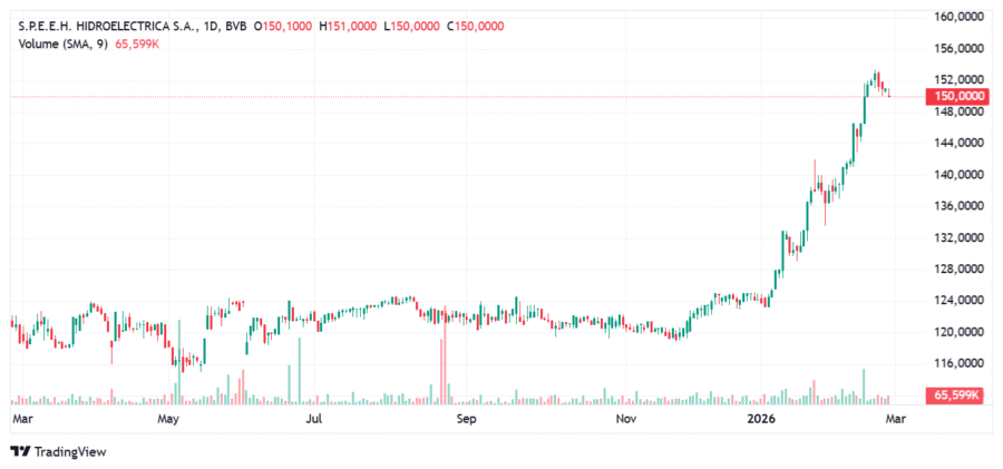 Acțiunile Hidroelectrica (H2O) au avut o evoluție spectaculoasă pe Bursa de Valori București în ultimele luni. După o perioadă de tranzacționare laterală în jurul nivelului de 120–125 RON pe parcursul majorității anului 2025, cotația a intrat într-un raliu puternic începând cu luna noiembrie, accelerând semnificativ din ianuarie 2026. Acțiunea a atins un maxim de aproximativ 155 RON în luna februarie, reprezentând o apreciere de circa 30% față de nivelurile din vara anului trecut. La data de 26 februarie 2026, H2O se tranzacționa la 150 RON pe acțiune, consolidând în apropierea maximelor recente.