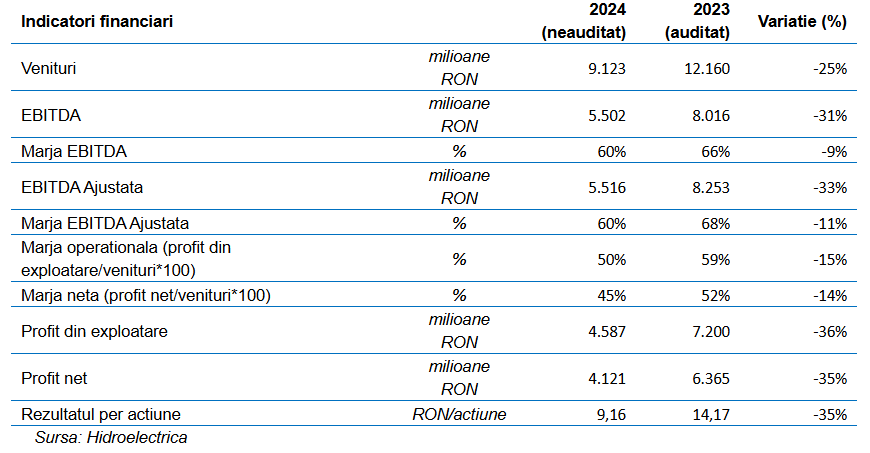 Grupul Hidroelectrica a inregistrat rezultate operationale si financiare in scadere pentru anul 2024, fata de anul 2023, influentate semnificativ de conditiile hidrologice mai putin favorabile, conducand la o productie hidroenergetica redusa fata de anul predecent si afectand volumul total de energie disponibil pentru comercializare.
