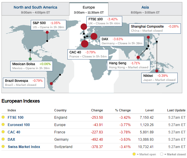 Deși săptămâna trecută indicii din Europa se aflau la maxime multi anuale, inclusiv indicele bursei de la Milano ITA40 care era la cel mai ridicat punct din 2008. Scenariul este total diferit în acest moment, indicele italian depreciindu-se cu 4,5%, în timp ce piețele din Franța (CAC40) și Germania (DAX) pierd 3,6%, respectiv 3,74%. Aceste evoluții vin în urma extinderii epidemiei din Coreea de Sud și Italia. Statul asiatic a anunțat 70 de noi cazuri, in timp ce in Italia numarul acestora a depasit 100, investitorii temându-se că ar putea fi doar începutul.