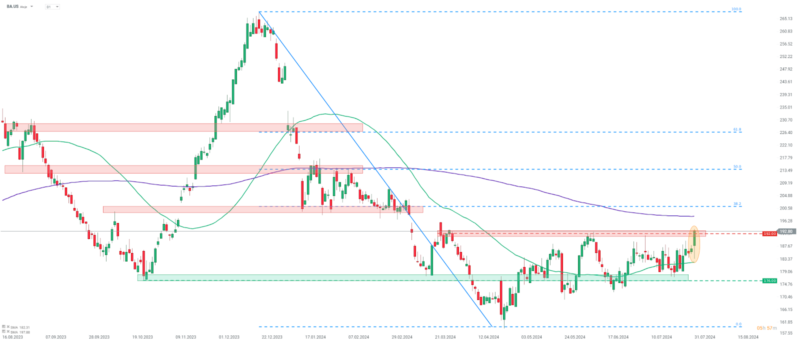Boeing (BA.US) se tranzacționează în creștere astăzi, investitorii sperând că noul CEO va ajuta la redresarea companiei. Prețul încearcă să depășească zona de rezistență de 192 USD, care a limitat mișcările ascendente de la sfârșitul lunii martie 2024. Sursa: xStation5