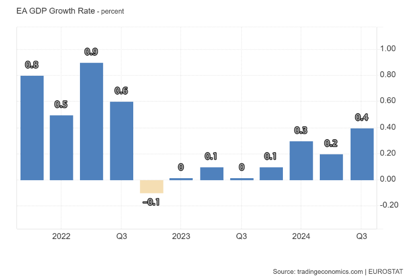 În primul rând, creșterea PIB-ului irlandez, notoriu pentru volatilitatea sa (semnificativ influențată de activitatea contabilă a multinaționalelor), a contribuit pozitiv la rezultatul de astăzi; fără Irlanda, PIB-ul zonei euro ar fi crescut cu 0,3%. În plus, creșterea PIB-ului Franței de 0,4% este probabil să fi fost impulsionată de Jocurile Olimpice de vară. Așadar, dacă ignorăm aceste factori unici, economia zonei euro arată o creștere modestă în prezent.