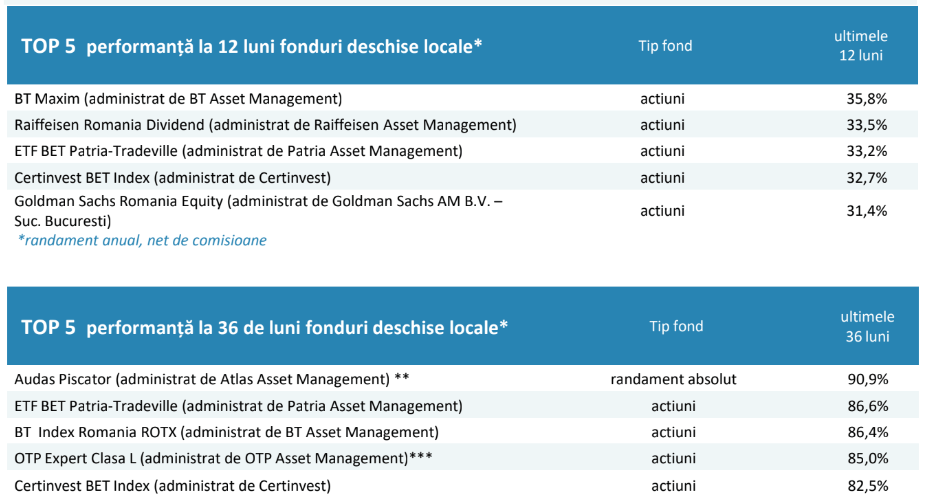 Cele mai performante 5 fonduri în ultimele 12 luni au înregistrat randamente anuale nete între 31,4% și 35,8% iar pe un orizont de 36 de luni între 82,5% și 90,9% (unele fiind denominate în valută), obținute de-a lungul ultimilor 3 ani de zile (față de luna octombrie 2020).