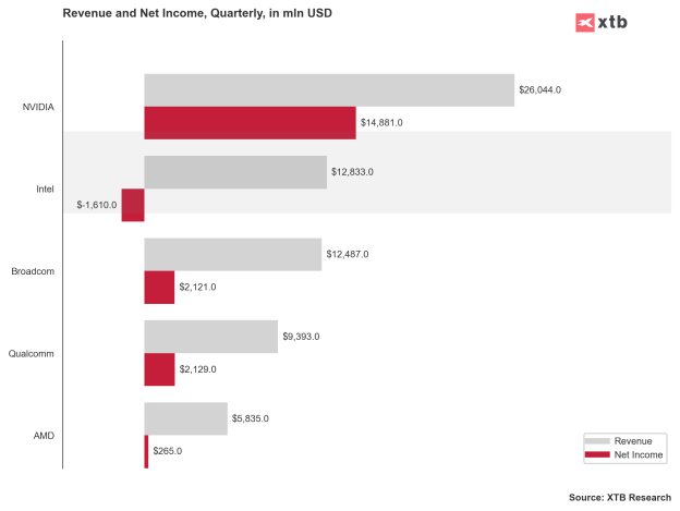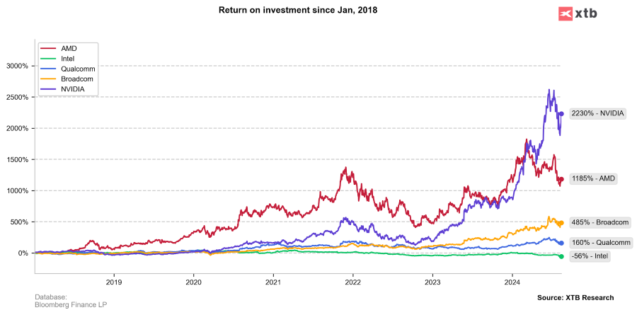 Față de concurenții săi, Intel arată palid, luând în considerare nu doar ultimul an, ci ultimii cinci ani. Sursa: Bloomberg Finance LP, XTB