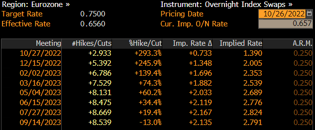 Piețele monetare includ aproape în totalitate în preț o creștere cu 75 de puncte de bază a ratei BCE la întâlnirea de joi. Sursa: Bloomberg