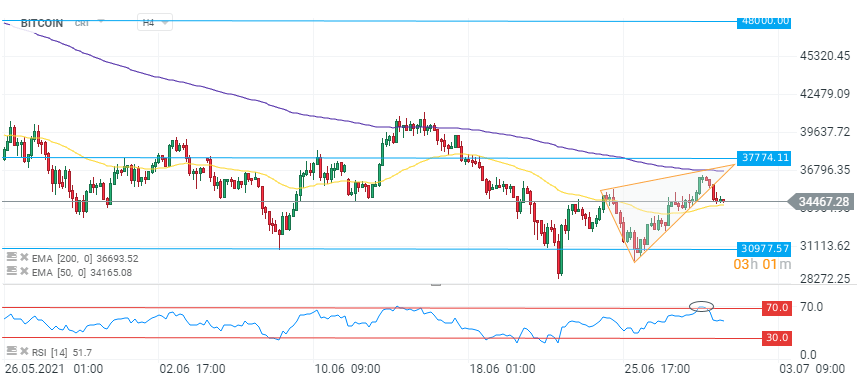 Un prim nivel de susținere se află la media mobilă pe 50 de perioade de pe graficul de patru ore, la 34.100 USD (linia galbenă).