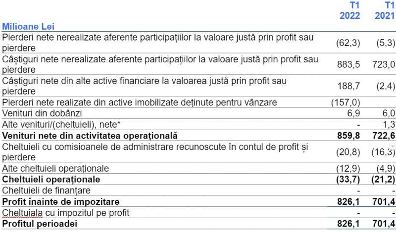 Principalul factor care a contribuit la profitul înregistrat în primul trimestru al anului 2022 a fost reprezentat de câștigul net aferent participaților Fondului înregistrate la valoare justă prin contul de profit și pierdere în valoare totală de 821,2 milioane lei generat de actualizarea evaluării Hidroelectrica, net de evoluția negativă a prețului acțiunilor deținerilor listate ale Fondului (care provine în principal de la OMV Petrom SA).