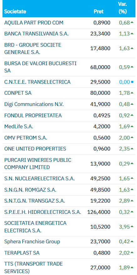 Aprecierile au fost ample, si cu excepția Transelectrica (TEL) care a stagnat, toate celelalte companii au avut creșteri cuprinse intre 0.3% in cazul Purcari Wineries (WINE) și 3.95% in cazul Electrica (EL).