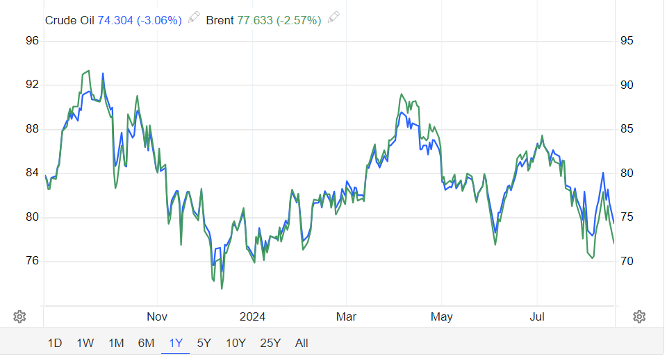 Prețul petrolului a înregistrat un declin semnificativ astazi, țițeiul Brent fiind tranzacționat la 76,62 dolari pe baril și West Texas Intermediate (WTI) la 74,40 dolari pe baril, în scădere cu aproape 3% față de săptămâna precedentă.