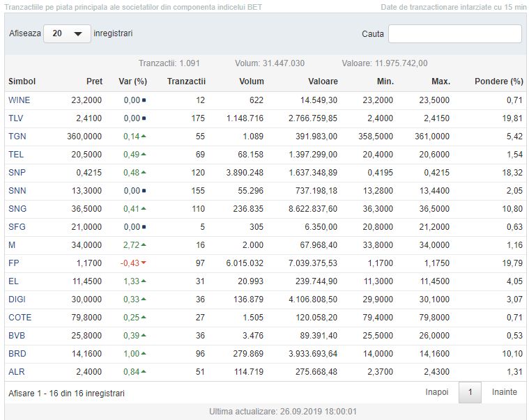 Din cadrul indicelui BET, cea mai mare crestere a fost inregistrata de acțiunile MedLife (M) +2,72%, urmate de titlurile Electrica (EL) +1,33%. La polul opus, o singura societate a avut o scadere a cotatiei: Fondul Proprietatea (FP) -0,43%.